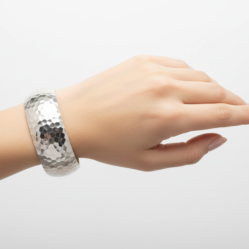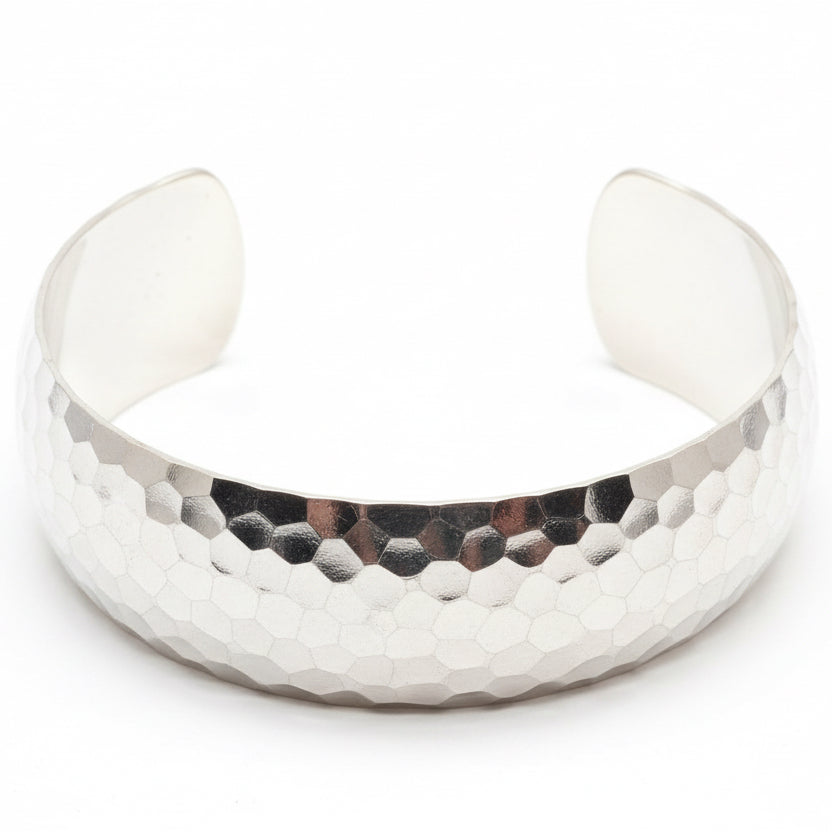 Expertly crafted in 92.5 sterling silver, this bold cuff bracelet features a hand-hammered texture that reflects light beautifully. Designed for a strong yet elegant look, it makes a statement on its own while offering a comfortable open-cuff fit. Perfect for those who appreciate timeless craftsmanship and solid silver jewellery.
