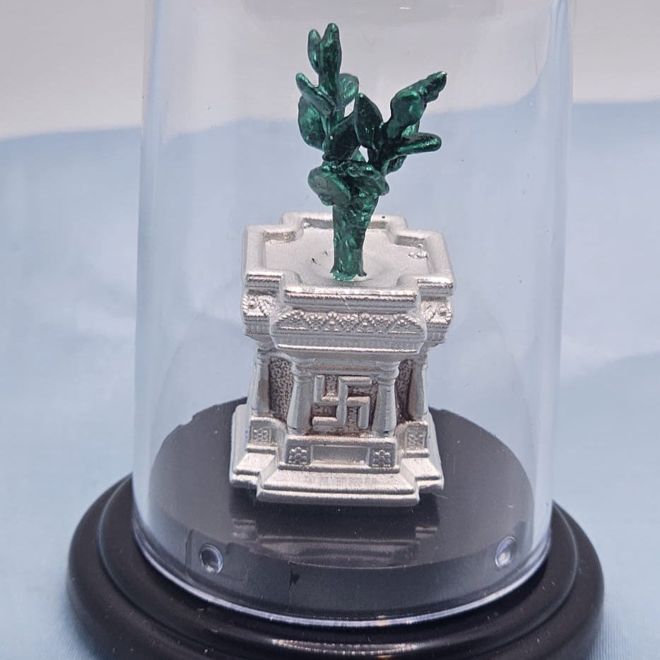 A beautifully crafted Tulsi plant idol in 92.5 sterling silver, placed on an intricately designed silver mandir base with a Swastik symbol. The green Tulsi leaves add a divine touch, while the piece is enclosed in a transparent glass dome with a black round base, making it both sacred and decorative.