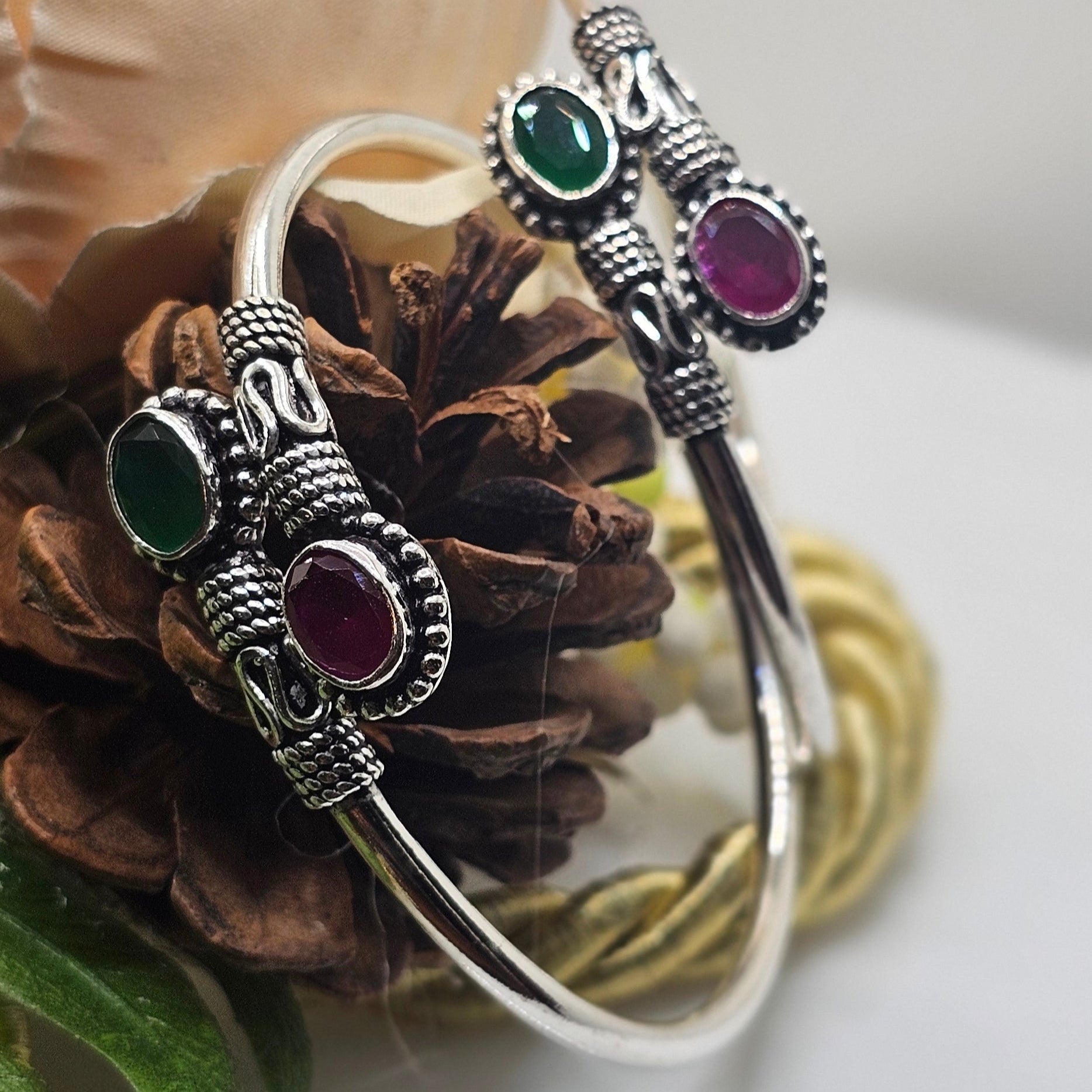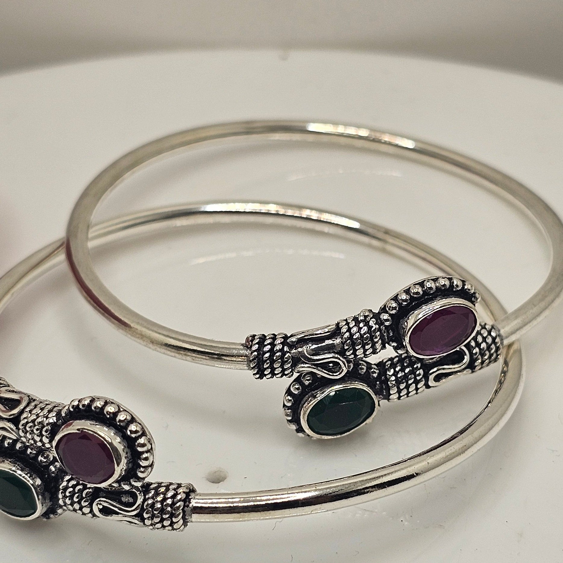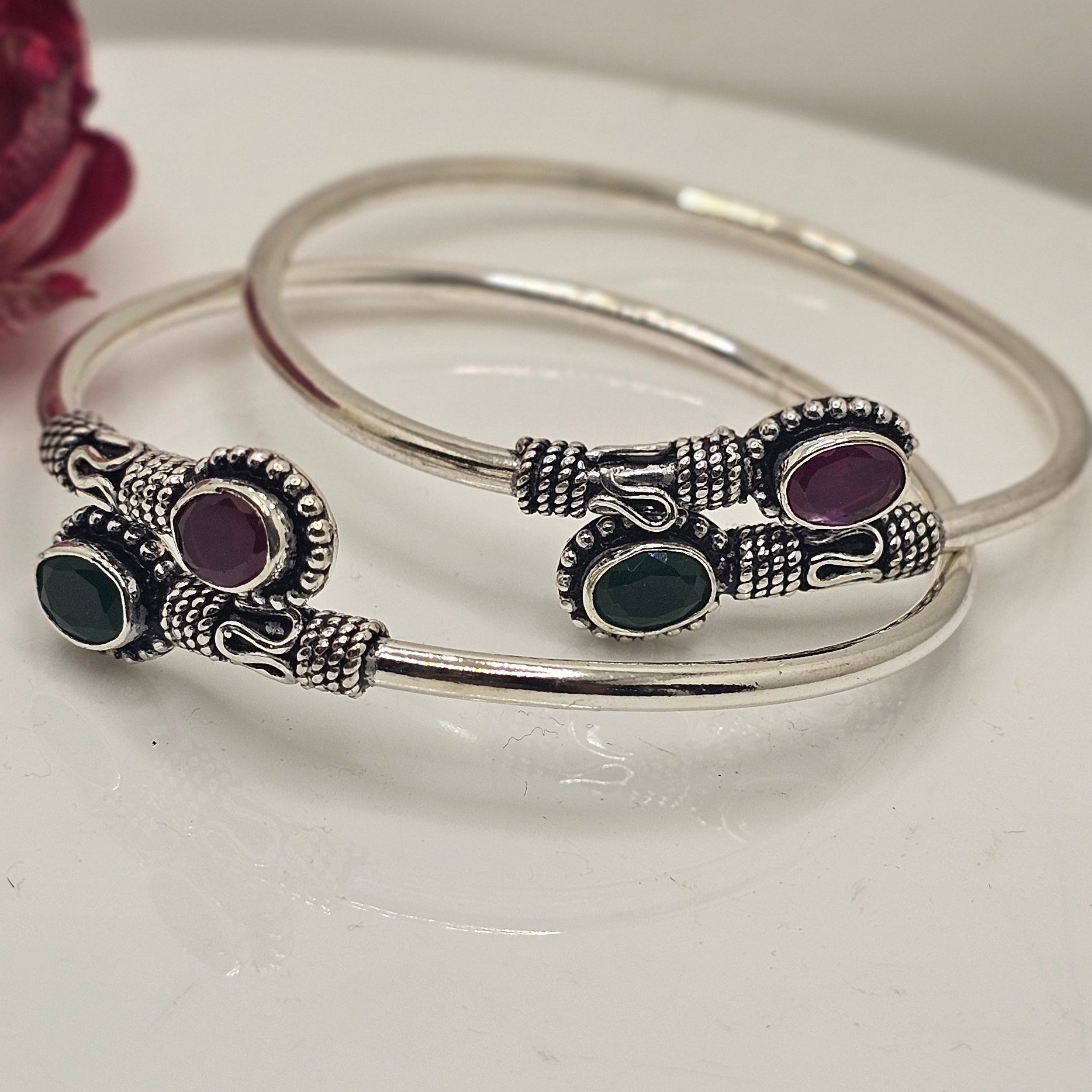 92.5 sterling silver beautifull pair of bangles. Wear that daily or in a party without any worry and they will keep adding to your shine always. Pink and green stone engraved ads up to thier beauty and let you match with outfit.