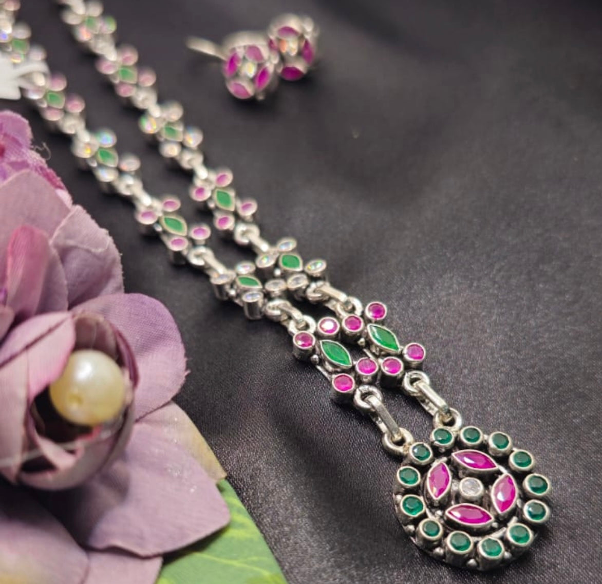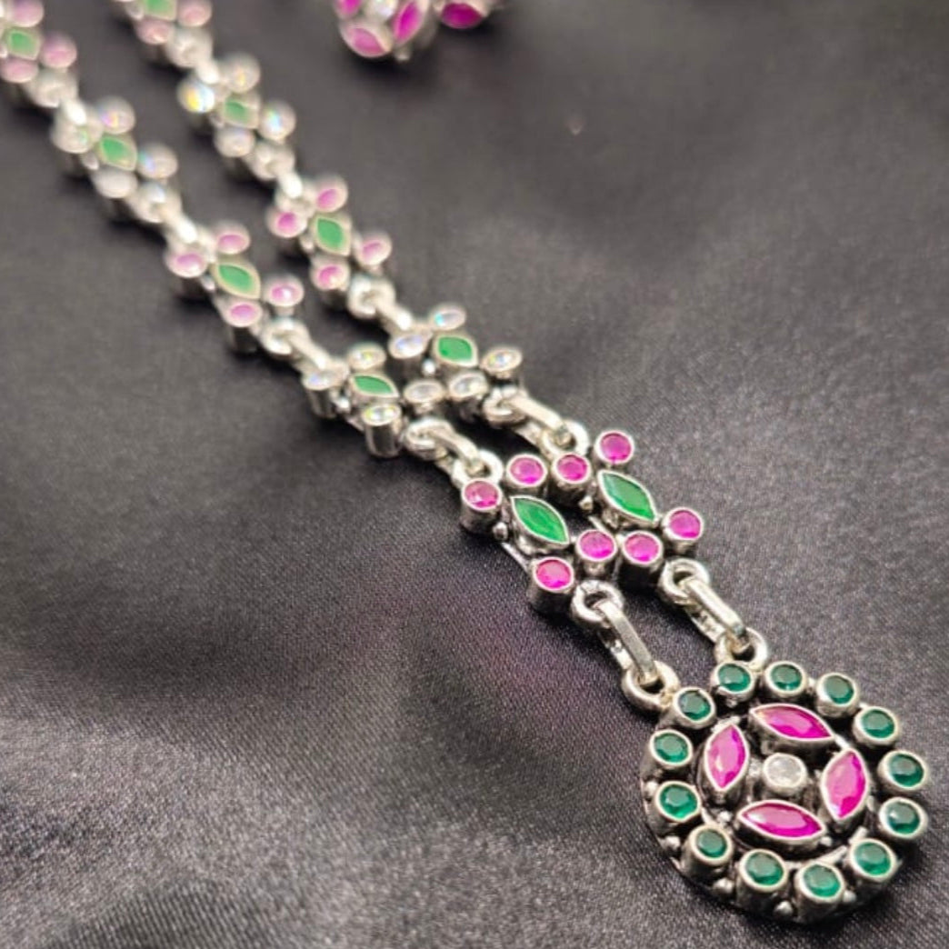 A vibrant piece adorned with dual-tone stones in deep pink and rich green, set beautifully in 92.5 sterling silver. The floral-inspired detailing paired with matching studs makes it a versatile set for traditional occasions, parties, or festive celebrations. A true fusion of elegance and color.