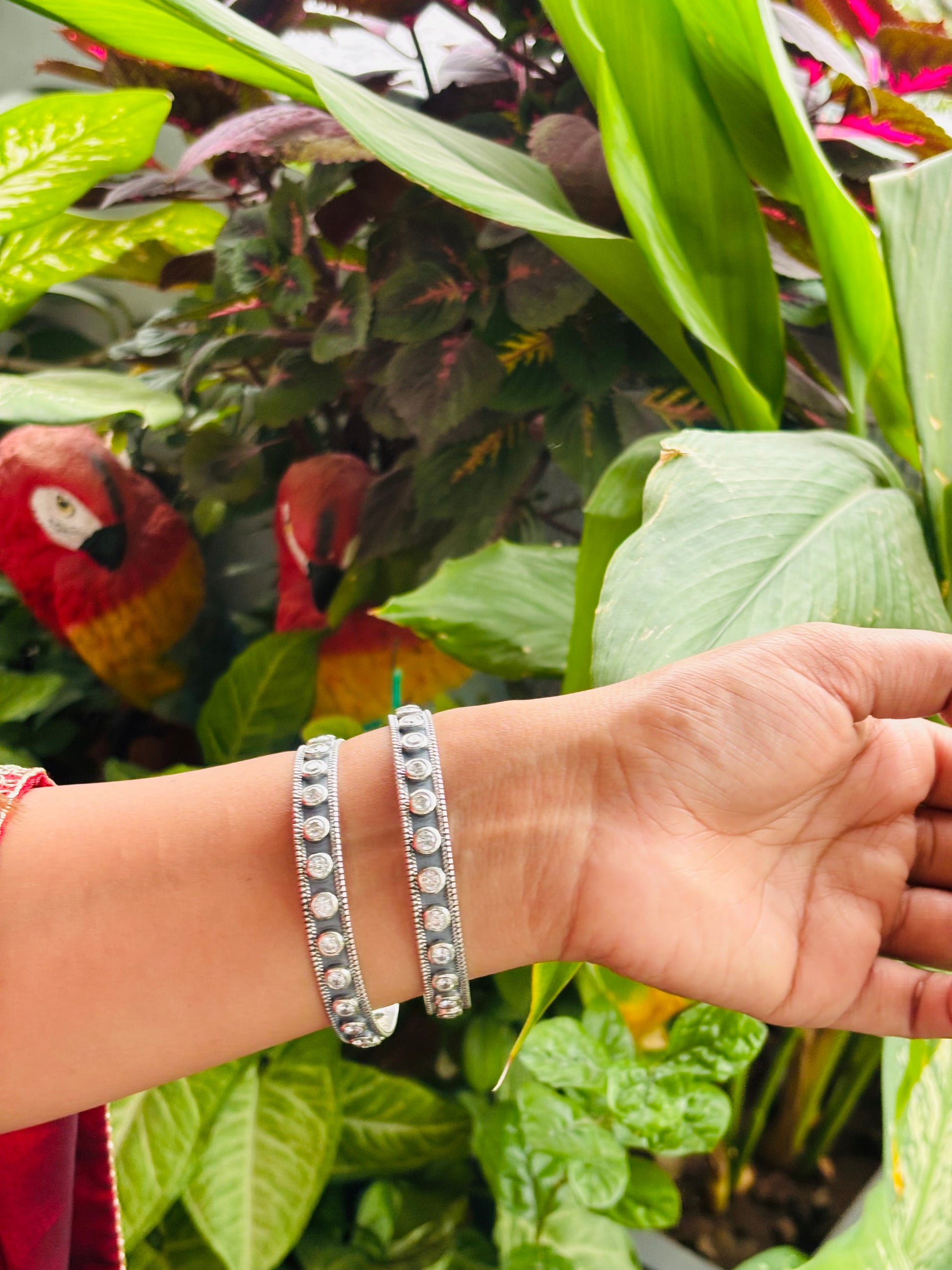 Make a bold statement with these Silver Circle Stone Oxidised Bangles, crafted to bring a perfect blend of traditional elegance and modern edge. The oxidised finish paired with round stone detailing gives them a classy and timeless charm.