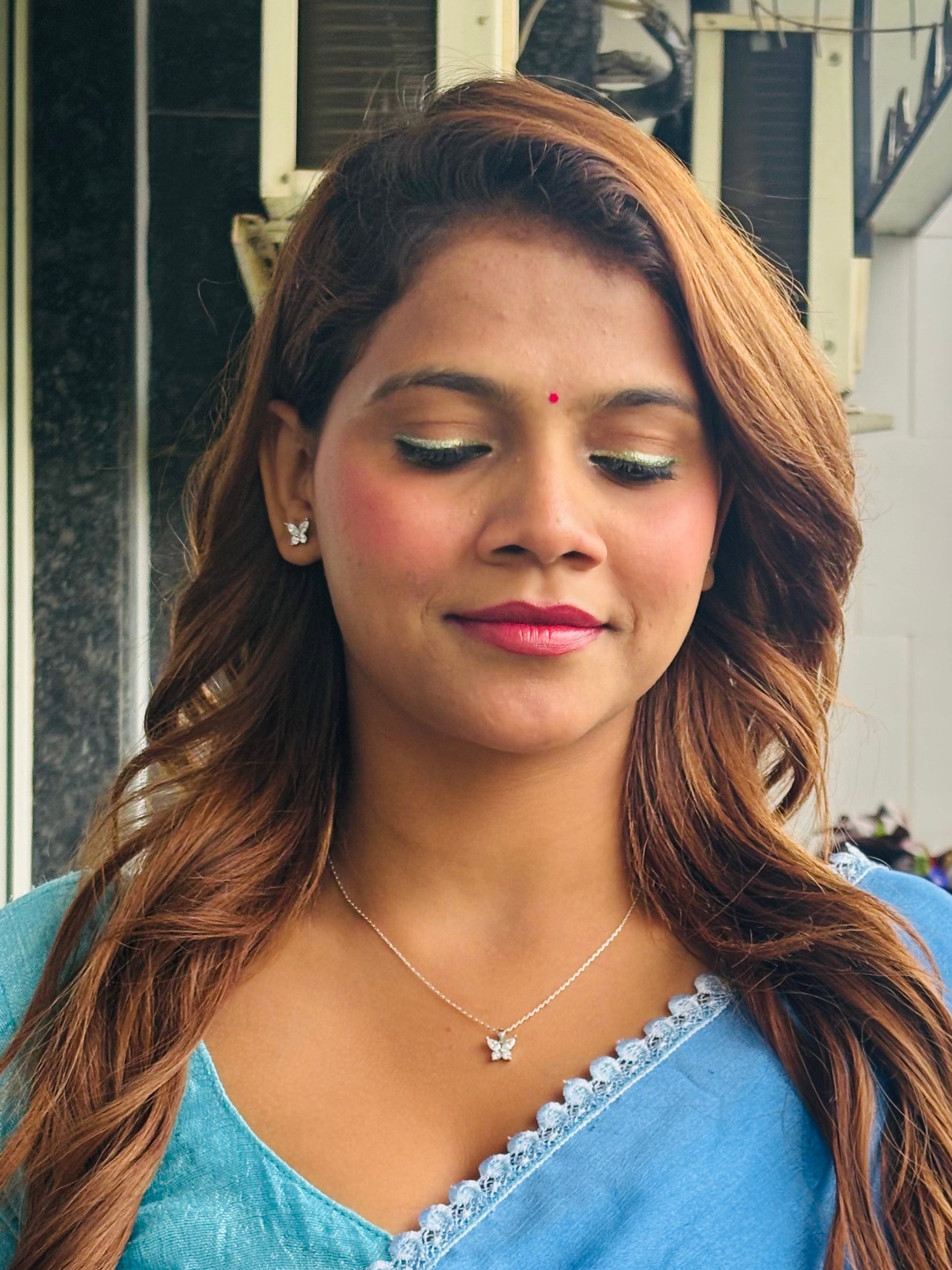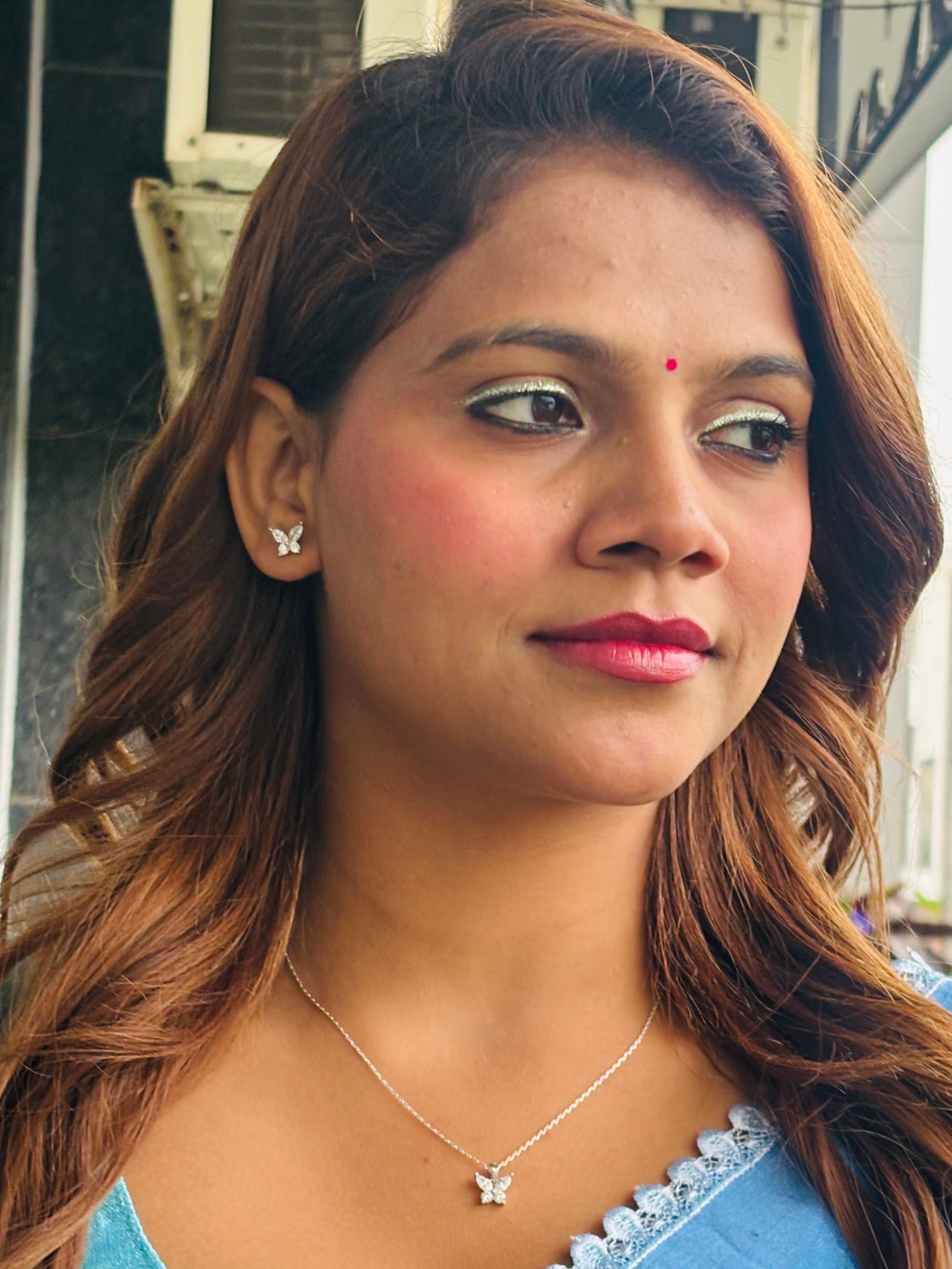 Delicate and elegant, this Silver Butterfly Set includes a sparkling pendant and matching stud earrings. Crafted with 92.5 sterling silver and detailed with shimmering stones, it adds a graceful charm to any outfit — perfect for daily wear or gifting.