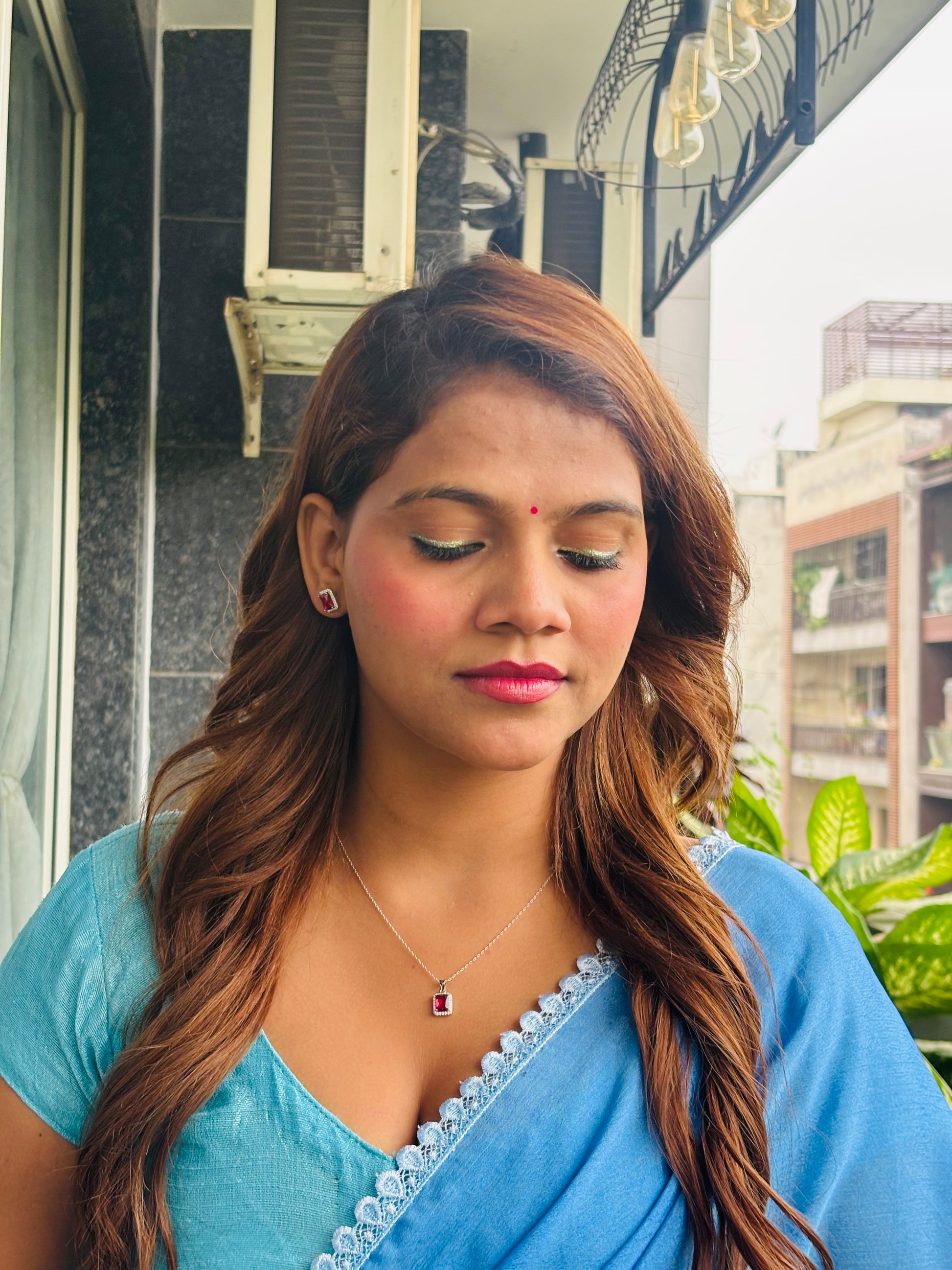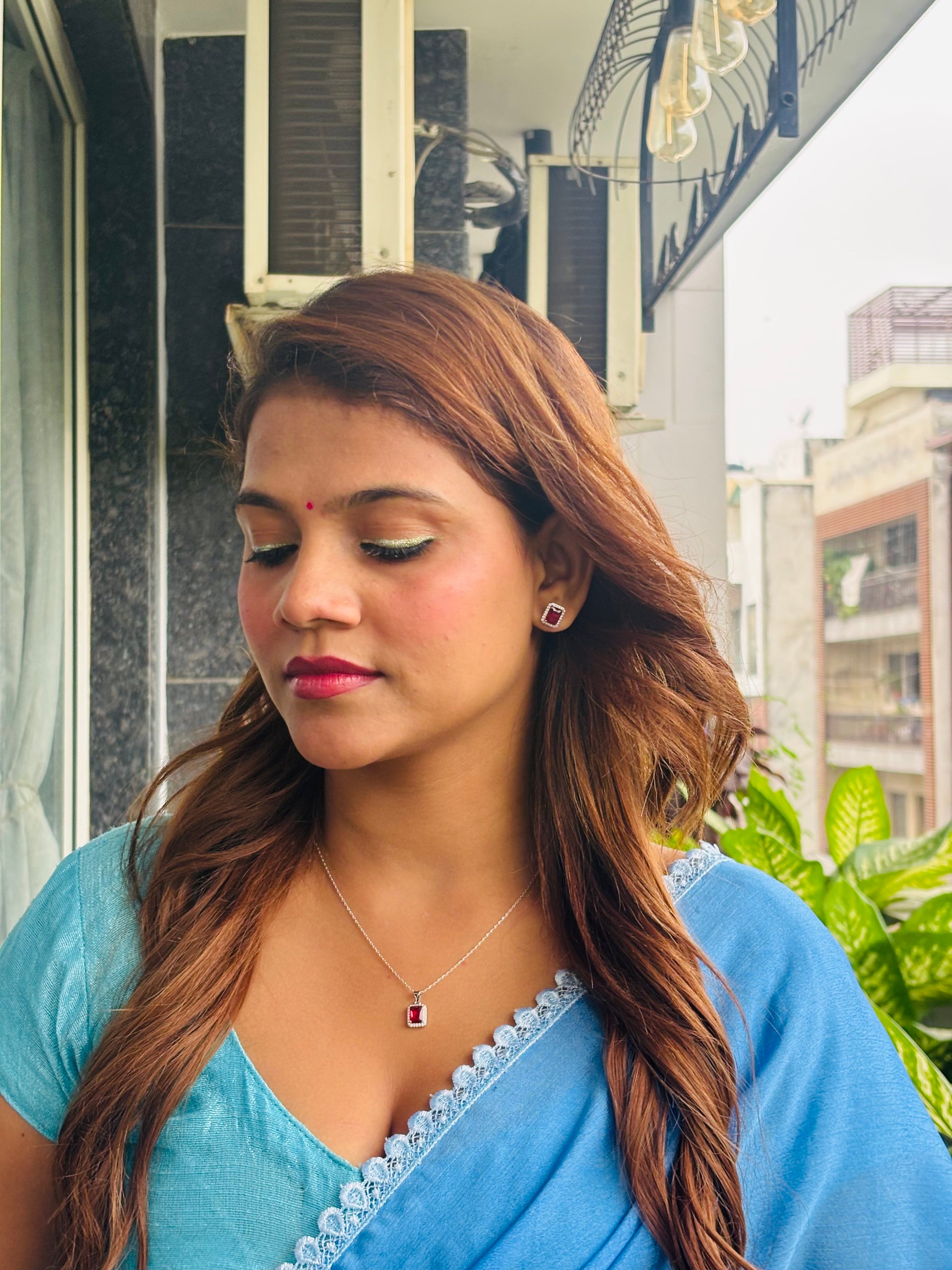 Crafted with 92.5 sterling silver, it features a delicate chain paired with a matching pendant and earrings for a timeless, graceful style.