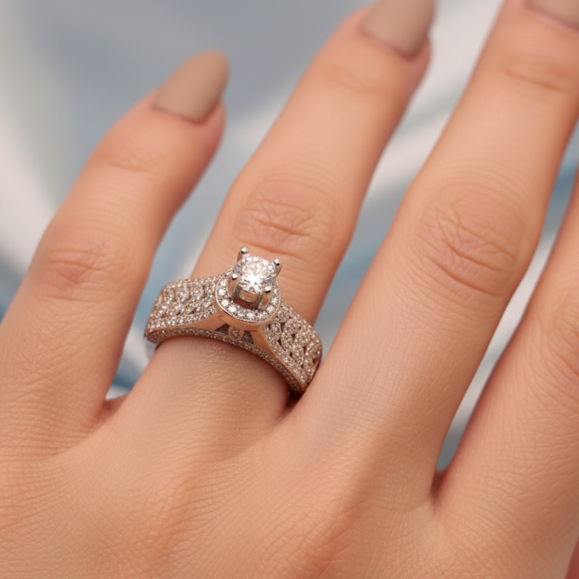 This stunning ring is crafted in 92.5 pure sterling silver and features a raised zircon solitaire with an intricately detailed shank adorned with micro zircon stones. The elegant leaf-inspired detailing on the band adds depth, sparkle, and a luxurious bridal finish.